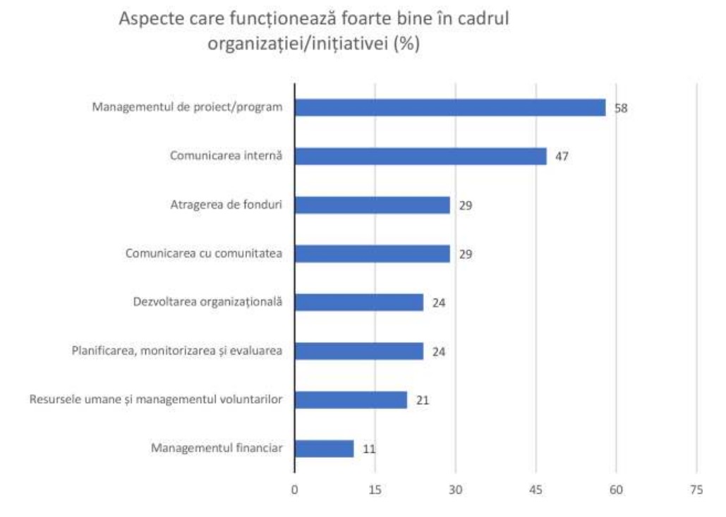 Provocările financiare și dificultatea atragerii de fonduri se află în topul clasamentului problemelor menționate de respondenți. Urmează provocările legate de dezvoltarea organizației (resurse umane, managementul voluntarilor, activitățile de planificare, monitorizare și evaluare). La aspecte care funcționează bine în organizațiile din Țara Făgărașului, cei mai mulți respondeți menționează managemenul proiectelor și comunicarea internă.