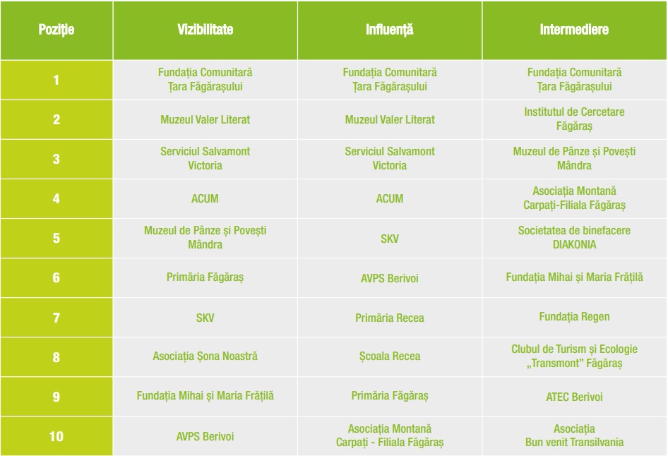 Aceleași organizații se regăsesc în top 10 pe fiecare indicator la nivel local, ca și în întregul ecosistem de relații, pe primul loc fiind Fundația Comunitară Țara Făgărașului, urmată de Muzeul Țării Făgărașului Valer Literat și Serviciul Salvamont Victoria. În topul entităților din ecosistemul de finanțare al organizațiilor locale, pe primul loc se află tot Fundația Comunitară Țara Făgărașului.
