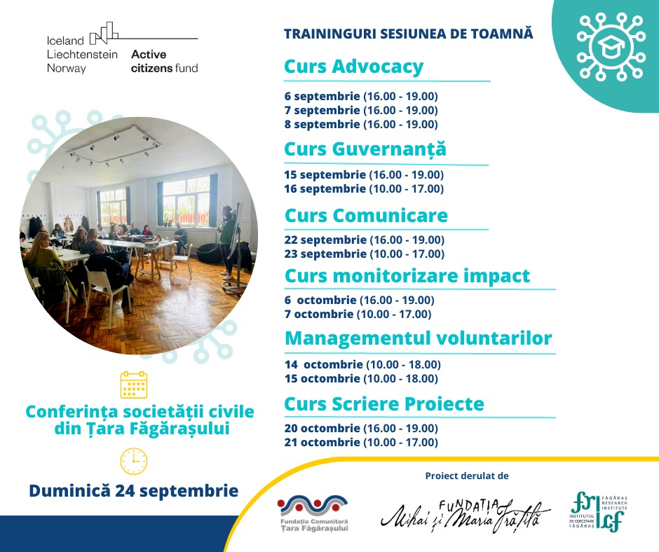 Toamna 2023 este perioada cu cel mai bogat calendar public în cadrul proiectului Dezvoltarea capacității ONG-urilor din Țara Făgărașului. În lunile care urmează ne vom întâlni des cu beneficiarii proiectului: septembrie este luna în care dăm startul unei noi serii de traininguri gratuite pentru reprezentanții societății civile, dar și luna în care ne dăm întâlnire cu toți membrii comunității făgărășene. Pregătim o întâlnire duminicală în mai multe spații din centrul orașului, deci salvați data: 24 septembrie 2023.În ce privește cursurile, invitația este deschisă în egală măsură celor care au participat la primele ateliere, organizate în primăvară, cât și cursanților noi, indiferent de nivelul lor (începători sau avansați).